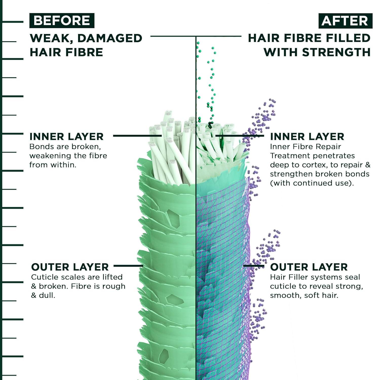 Our sulfate-free Hair Filler + Ceramide system, formulated with Ceramide + Citric Acid + Repair Care Complex, fills colored and bleached hair with color vibrancy. System for inner fiber repair*, outer visible transformation. INNER: Repairs and strengthens broken bonds deep in the cortex, hair fiber's inner layer*. OUTER: reverses up to 1 year of damage to smoothness. Up to 9X smoother hair** & 4 weeks vibrant color. Formulated without sulfates, silicones, parabens, phthalates, DMDM Hydantoin, and mineral oil. Additionally, all Garnier products, globally, are officially approved by Cruelty Free International under the Leaping Bunny Program. *repair & strengthen broken bonds inside the hair fiber with continuous use of system **with continuous use of system ***with use of system vs. non-conditioning shampoo