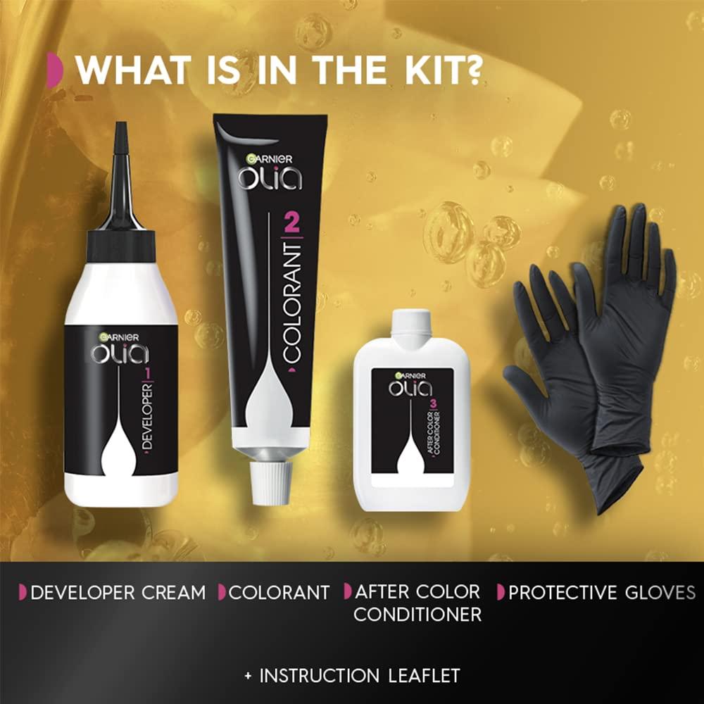 Garnier Olia is unlike any other traditional, permanent hair color. Powered by a 60% oil blend formula with natural flower oils, Olia propels colorants deep into the hair, giving you vivid color results and 100% gray coverage. The oils help to reverse roughness and dullness without hair feeling weighed down. The non-drip formula has no ammonia, so it smells great as you apply. The end result? More brilliant, long-lasting color and hair that is hydrated, silky, looks full and up to 3x shinier than uncolored, unwashed hair. What's in the hair dye kit? A developer applicator, a colorant tube, after color conditioner, as well as a set of gloves and the instruction sheet. Packaging May Vary